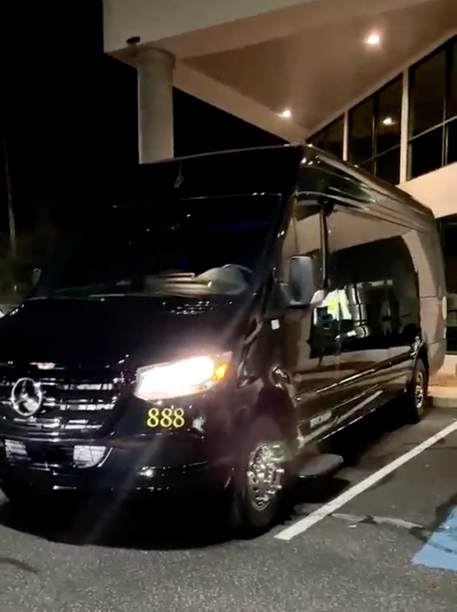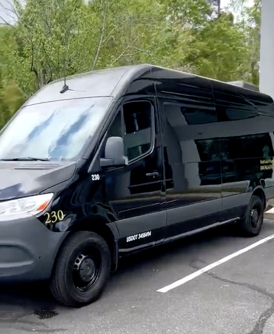 A premium 15 passenger luxury van with a sleek black interior, ideal for corporate transportation, airport transfers, and event shuttles.